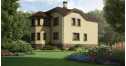 Внешний облик дома формируется большим эркером на заднем фасаде, выступающей частью гостиной и красивым полуарочным сводом над крыльцом. Эркер проходит через все этажи и на разных уровнях в нем располагаются: техническое помещение, столовая, остекленная лоджия.