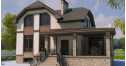 Главный фасад украшен объемным двухэтажным, панорамно остекленным эркером, проходящим через все три яруса, и красивым входным крыльцом. С обратной стороны расположена угловая терраса, а еще одна терраса, в открытом исполнении, находится на уровне мансарды. Каменные опоры, ажурные ограждения и полувальмовая крыша являются отличным украшением коттеджа в европейском стиле.