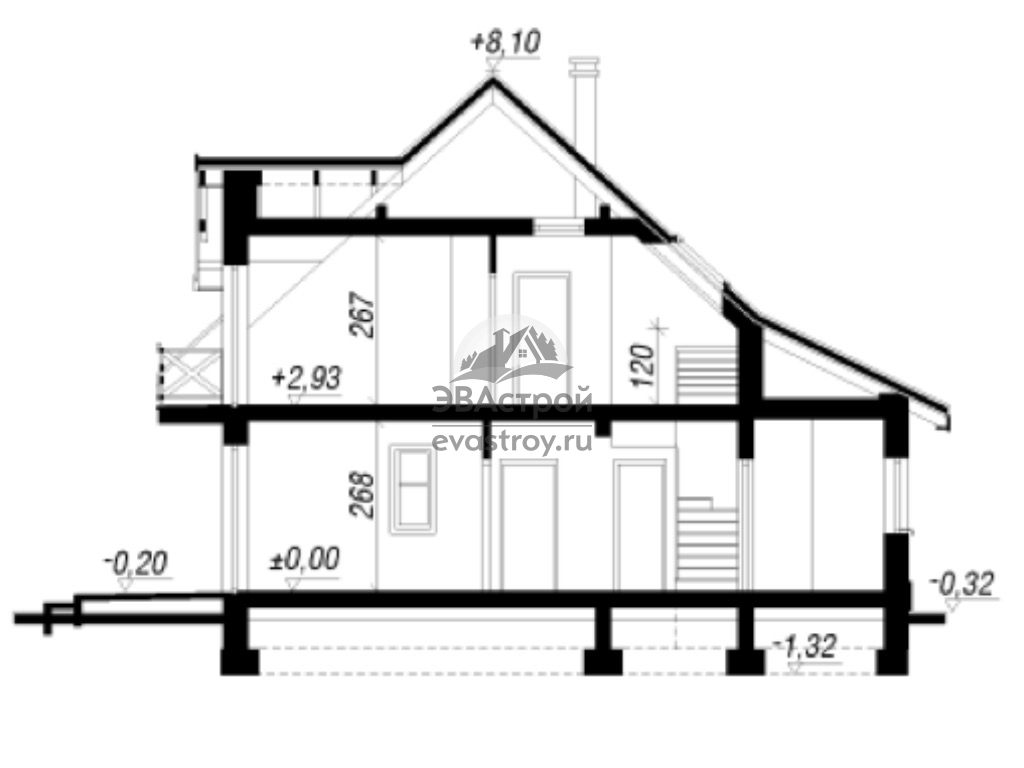 За стеной гостиной обозначен кабинет — и окна обоих помещений открываются на террасу. Техническое помещение работает как котельная и постирочная. Лестница с кладовой по ней ведет в мансарду, предназначенную исключительно для ночной зоны. Здесь все просто: три спальни и общий санузел, где хватит места для всей необходимой сантехники. Украшением мансарды служат два балкона и слуховое окно над террасой.