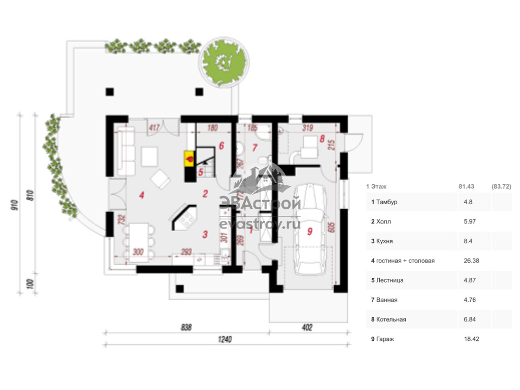 Габариты дома: 12.4 x 9.1 м;