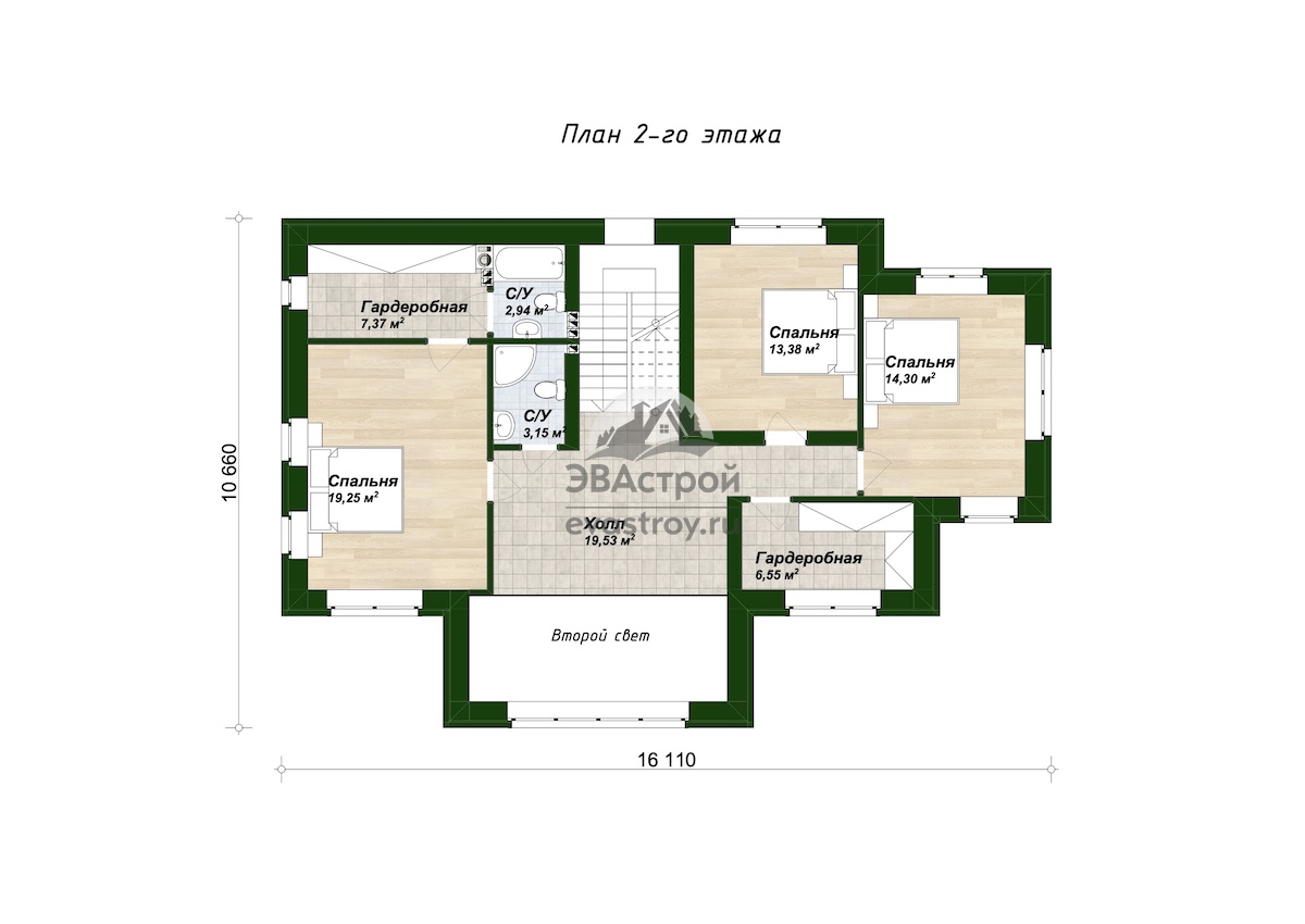 На втором этаже три спальни, общая гардеробная, санузел и холл. Мастер-спальня располагает собственной вместительной гардеробной и санузлом. Еще одним ее отличием является обособленное расположение.
