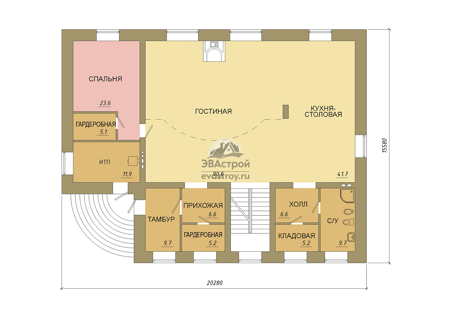 При габаритах 20.28 x 15.58 м дом хорошо встанет на узкий участок. В нем даже при множестве гостей можно найти покой и уединение.