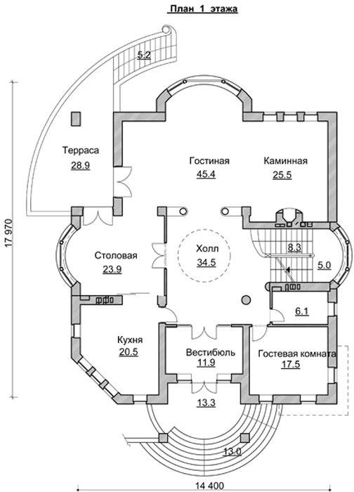 Центром первого этажа станет двусветный холл 34 м2. Вокруг расположены: эркерная гостиная с колонным входом и каминный зал; эркерная столовая и удобная светлая кухня; комната для гостей. Из гостиной и столовой выполнены выходы на террасу.