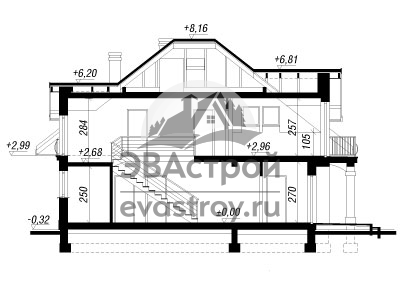 Эффектный нарядный дом (193 м2) с квадратным планом стилизован под старинную европейскую усадьбу. Однако, традиционный облик коттеджа — не повод отказываться от современных удобств, которые в данном проекте представлены в виде: Мансардного верхнего яруса; Встроенного гаража; Трех уютных спален; Отдельной прачечной; Гостиной с камином; Небольшой террасы. Технические решения, дизайн Стены коттеджа имеют основной несущий слой, образованный кладкой из газобетонных или пустотных керамических блоков. Толщина этого основного слоя — 25 см. Для лучшего удержания тепла предусмотрен утепляющий слой пенопласта (14 см). Высота в коньке — 8.16 м; Высота 1-го этажа — 270 см; 2-го — 257 см; Высота мансардной стены — 105 см. Снаружи дом отделан кремовой штукатуркой с ярко-белыми акцентными деталями. Большую роль в экстерьере играет высокая четырехскатная крыша под керамочерепицей, с крупными люкарнами и плоскими кровельными окнами. Арочные окна мансарды, кованые балконы, расстекловка и излюбленный элемент староевропейских домов — эркер — все эти выразительные «мелочи» прекрасно ложатся в общую картину дизайна, делая образ дома цельным и завершенным. Отдельно стоит отметить входную группу — крыльцо с двухколонным портиком и верхним балконом. Планировка Тамбур выполняет две основные функции: это защита от холода, а также проходная зона, ведущая в гараж и — через кладовую — на кухню. Гардеробные шкафы размещены в передней полузакрытой части холла. Гостиная объединяет зону отдыха и обеденную группу в эркере; очень кстати будет выход на террасу. Кухня полузакрыта, с отдельным входом из холла и удобной рабочей зоной. Жилая комната расположена в незаметном месте, за лестницей, сблокирована с санузлом и мини-гардеробной. Здесь удобно устроить кабинет или гостевую. Мансардный ярус вместил три спальни с выходом на балкон, общую ванную и постирочную. Для родителей предусмотрена своя гардеробная. Комнаты очень светлые, в том числе благодаря кровельным окнам. Лестница также имеет естественное освещение. Для покупки проекта оставьте заявку на сайте или свяжитесь с менеджерами «Эвастрой» по контактному телефону +7 (495) 175-30-42.
