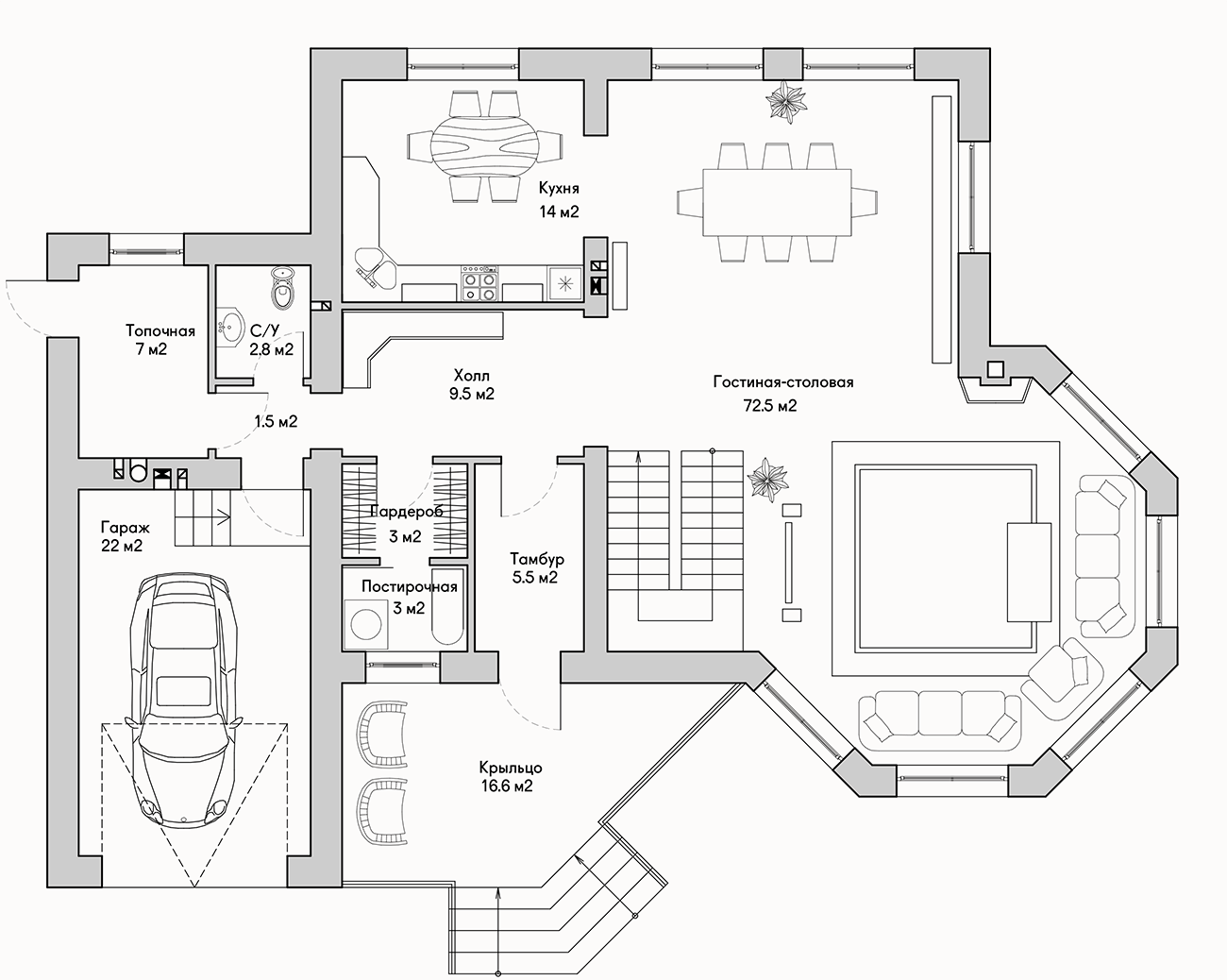 Этот мансардный коттедж привлекает оригинальной отделкой с элементами фахверка, большим многогранным эркером и верандой второго яруса. Сразу же замечаешь пристроенный гараж, а значит, проект, решает две проблемы — создание комфортного жилья для семьи из трех-четырех человек и теплой автопарковки, где вашему «железному коню» будут не страшны погодные неурядицы. Прочие особенности и преимущества: общая площадь — 231 м2; 3 спальни и 3 санузла; обширная гостиная-столовая; отдельная постирочная. В технической части проекта в равной мере использованы современные и традиционные решения. К последним, в частности, относится материал несущих стен — кирпич. Конечно, он уступает газобетону по легкости и скорости кладки, однако, в таких показателях, как прочность и долговечность, кирпичу до сих пор нет равных. Фундамент и перекрытия выполнены в сборно-железобетонном варианте, а для покрытия кровли использован относительно новый материал — металлическая черепица. Еще одним современным решением можно считать фасадную штукатурку, поскольку выпускаемые сейчас составы обладают превосходными рабочими характеристиками, и не только украшают дом, но и надежно защищают его от влаги и пыли. Разнообразят фасад фрагменты из искусственного камня и деревянные накладки, имитирующие фахверк. Планировка Площадь крыльца (16,6 м2) позволяет использовать его в качестве террасы. Сидя в плетеном кресле, можно наблюдать за закатом солнца или просто наслаждаться теплой летней погодой. Тамбур предназначен исключительно для защиты от холода. Для верхней одежды обустроена небольшая гардеробная, а рядом компактная постирочная, куда войдут стиральная машина и гладильная доска. Гостиная целиком занимает эркер и, благодаря пяти окнам, прекрасно освещена. Свою долю уюта вносит и камин. В зоне столовой поместится большой парадный стол, а для повседневных трапез семье хватит компактного кухонного столика. Хозблок занят гаражом, топочной и санузлом, проход в него из холла. Из топочной можно выйти на участок. В мансардном ярусе три спальни, две из них имеют площадь более 20 м2. Обстановку дополняют два общих санузла, в одном из них можно установить гидромассажную ванну. Из спальни, расположенной в эркере, есть выход на веранду второго яруса. Узнать интересующую информацию можно по контактному телефону +7 (495) 175-30-42.