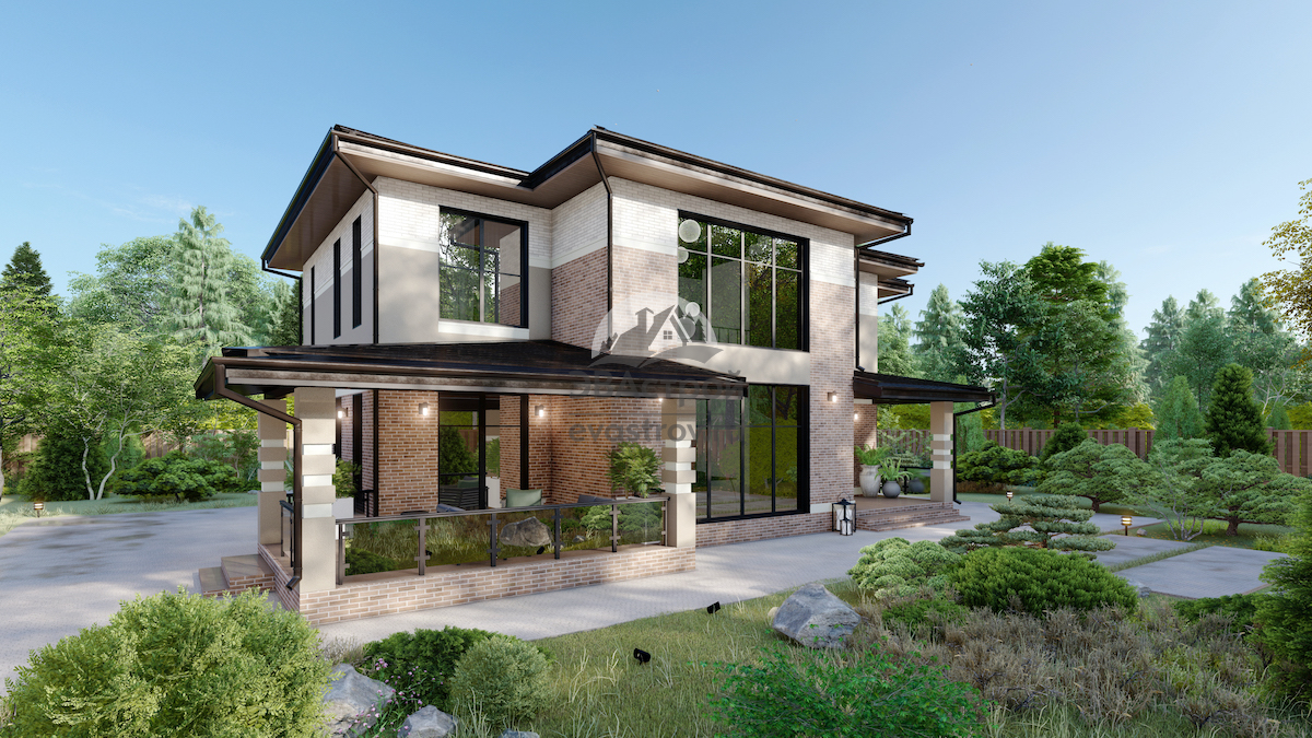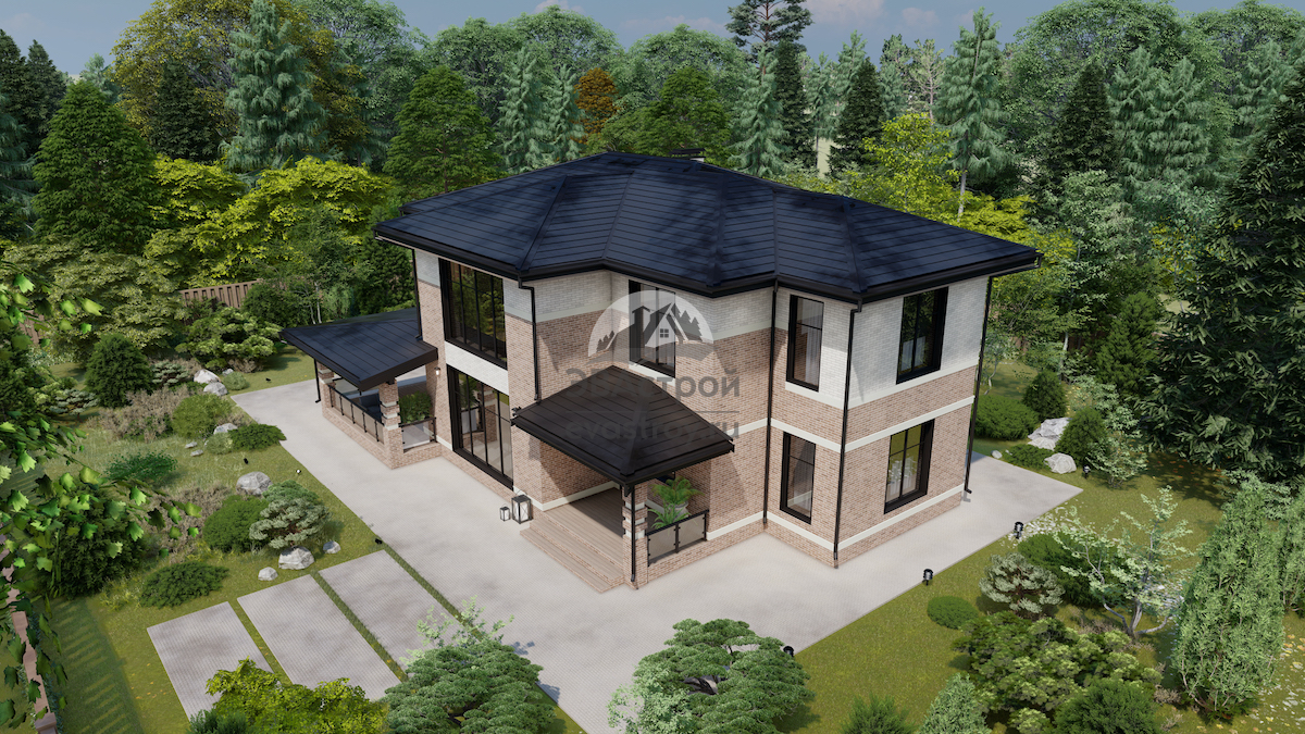 332.58 м2Как правило, проекты домов со вторым светом предполагают строительство с нуля, поскольку воплотить такое архитектурное решение в уже выстроенном доме достаточно проблематично и затратно. Обычно проекты коттеджей и домов со вторым светом предполагают отсутствие перекрытий между этажами с созданием обширного балкона внутри жилого помещения. При этом архитектор, применяя такой прием, стремится получить ощущение пространства и солидности. Дом всегда будет светлым, кроме того, он позволяет экспериментировать с остеклением, например, использовать витражи. Вариантов декорирования этого типа помещений огромное количество, включая нестандартное искусственное освещение. Однако при этом важно помнить о том, что обширные пространства с высокими потолками требуют особого внимания в вопросах отопления. Современные отопительные системы позволяют решить данную проблему без особых хлопот, и все же об этом следует подумать еще на этапе проектирования.